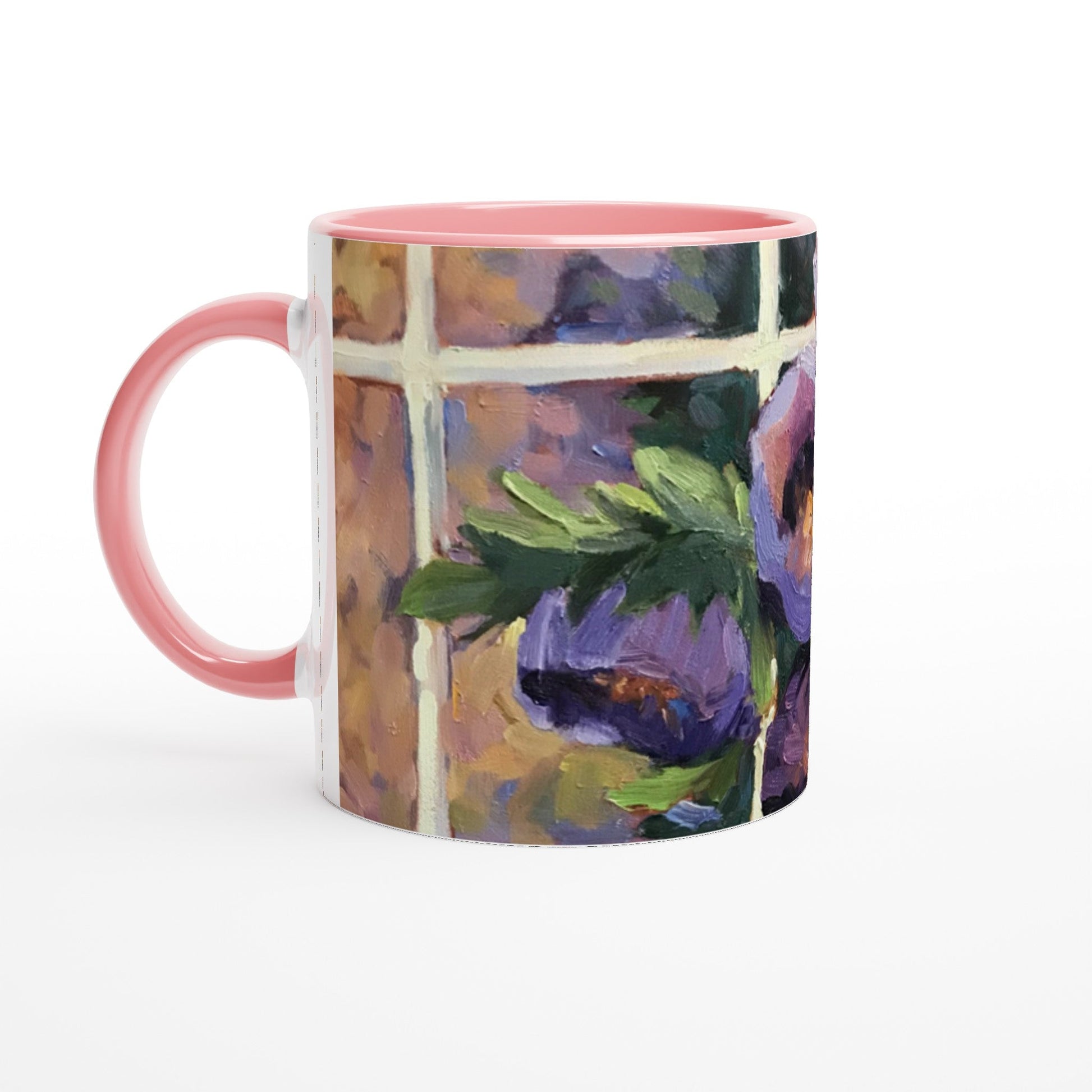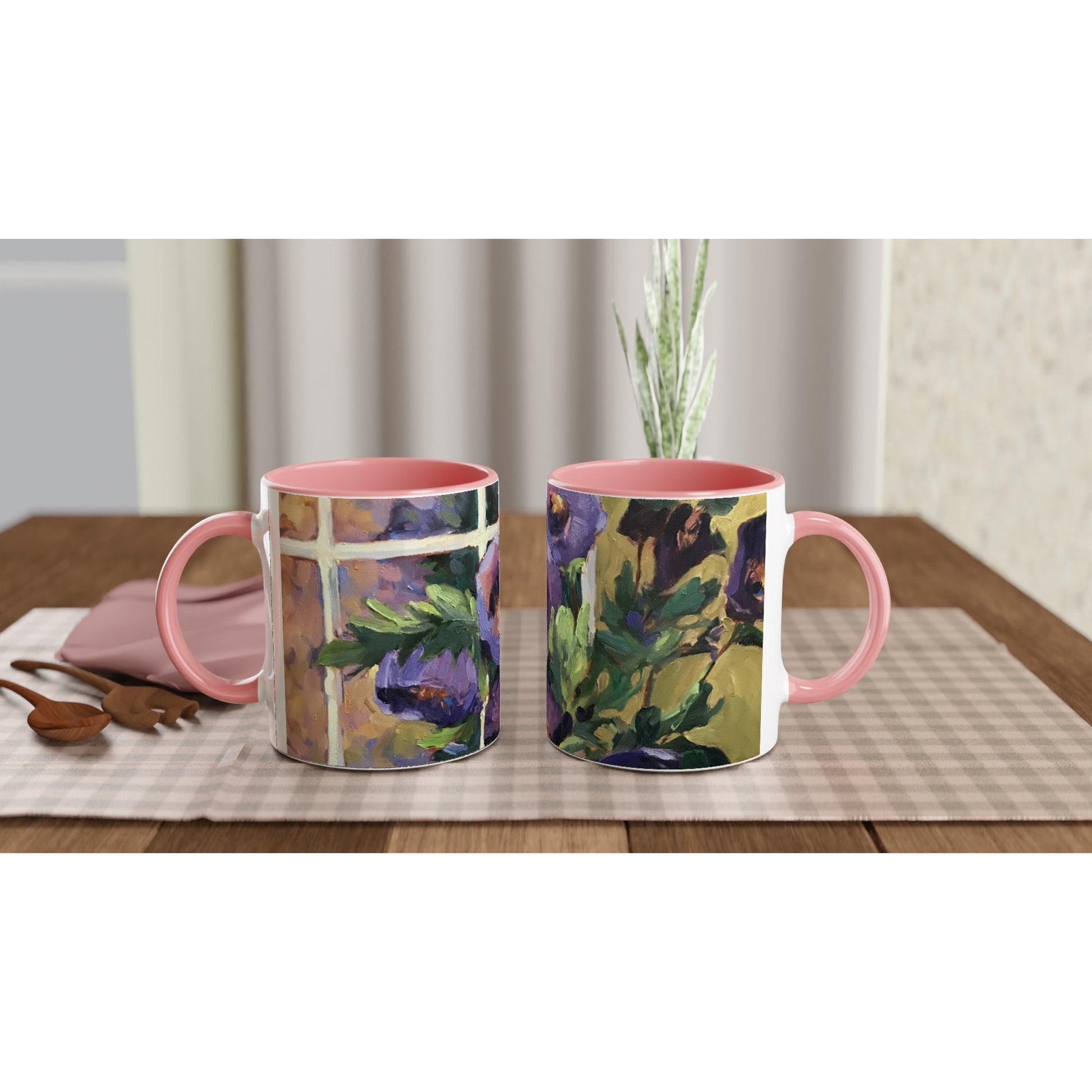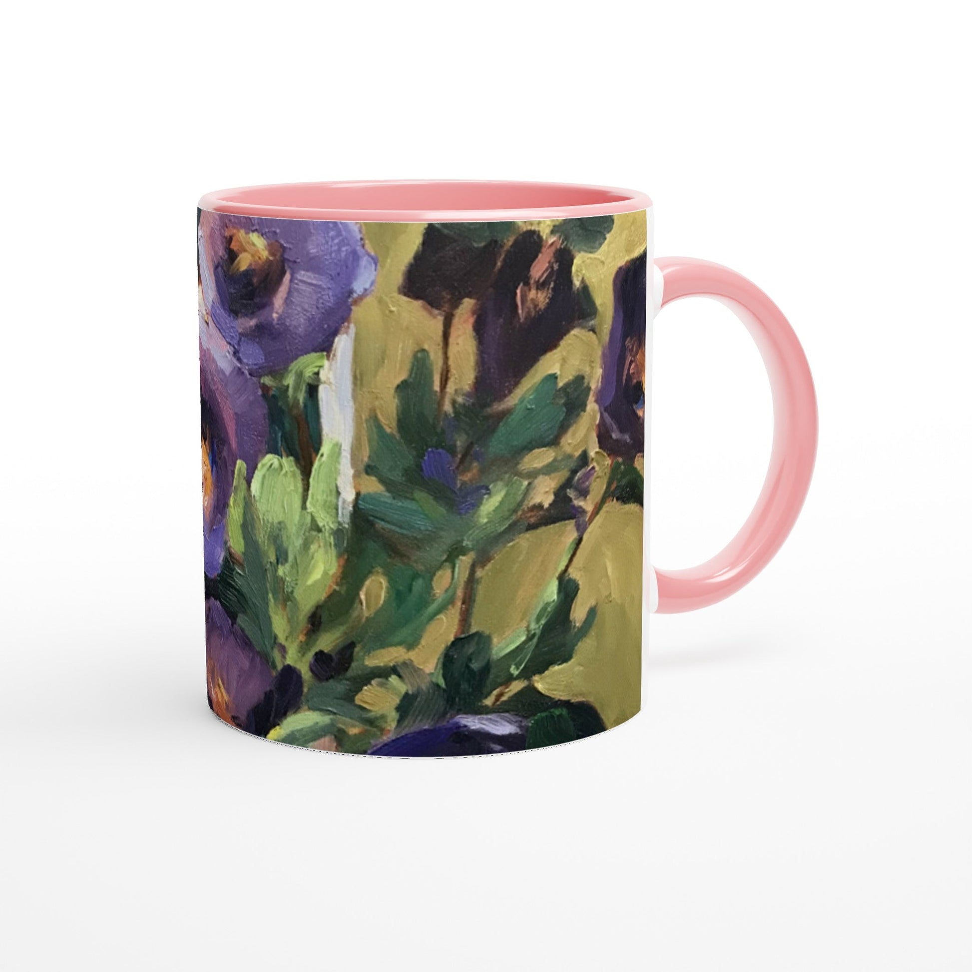 11oz White Ceramic Mug with Color Inside | Coffee Cup with 'Purple Flowers' Artwork by American Artist Barbara Cleary