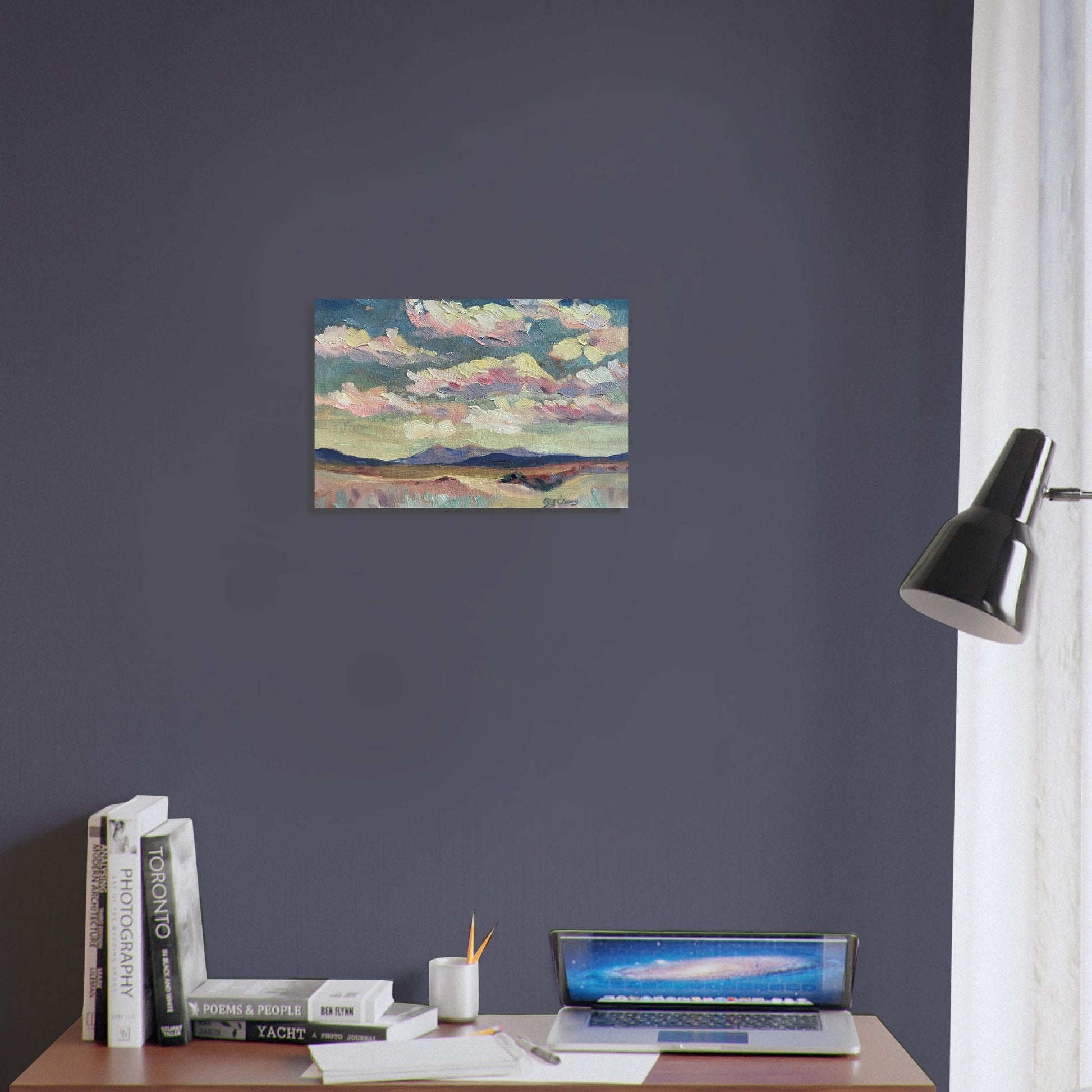"Rio Chama" captures the tranquil charm of the Rio Chama river, flowing through the stunning Southwestern terrain. Barbara Cleary’s masterful use of oil paints brings out the rich textures and vibrant colors of this landscape, showcasing the majestic river, rugged hills, and expansive sky. The painting beautifully illustrates Cleary’s deep appreciation for the natural world, portraying the raw and untouched beauty of the Southwest.
